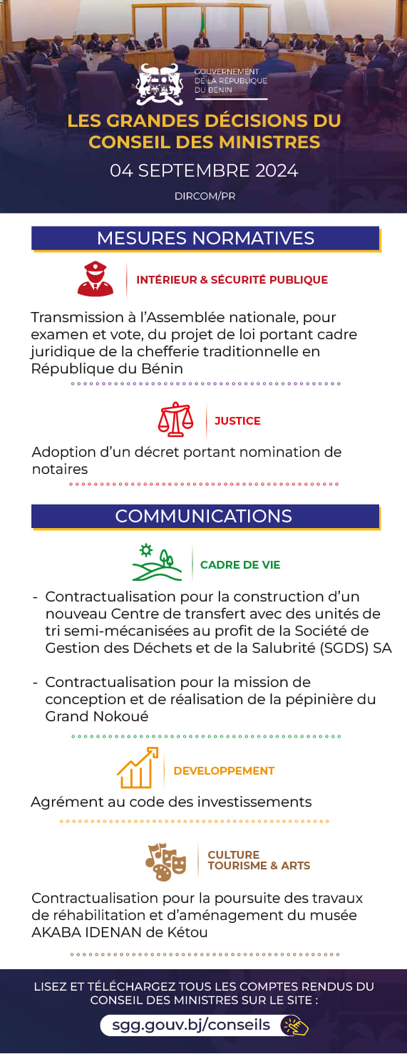Bénin: les grandes décisions du conseil des ministres du 4 septembre 2024