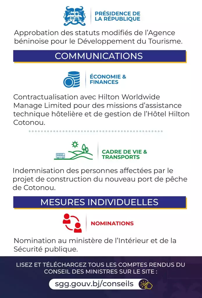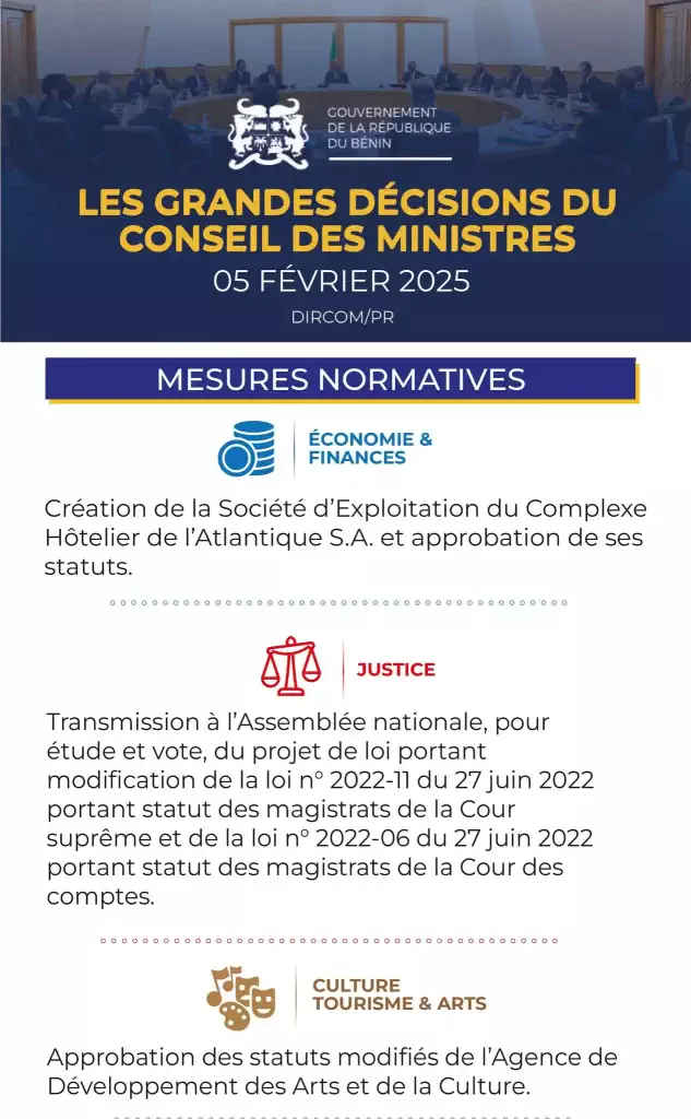 Le Conseil ordinaire des ministres du gouvernement du Bénin s’est tenu une fois encore ce mercredi 05 février 2025, sous l’égide de son excellence Patrice Talon. Au cours de cette rencontre, assez de résolutions ont été prises, dont en voici les grandes lignes.
