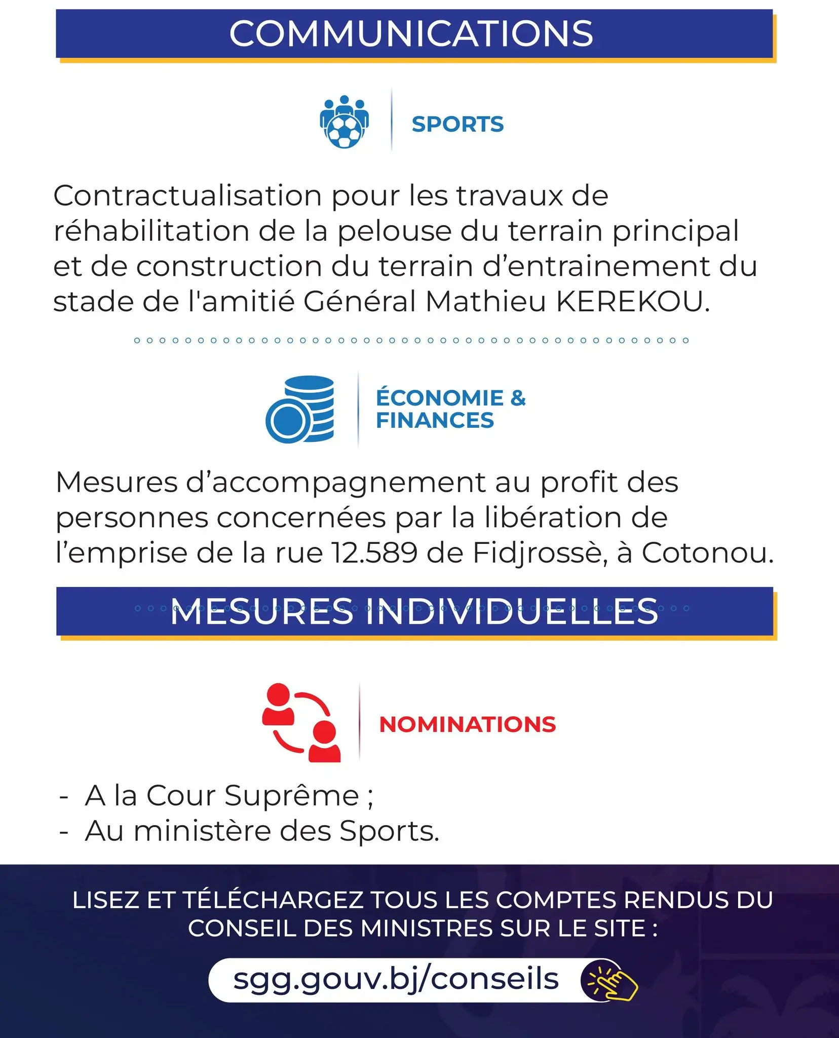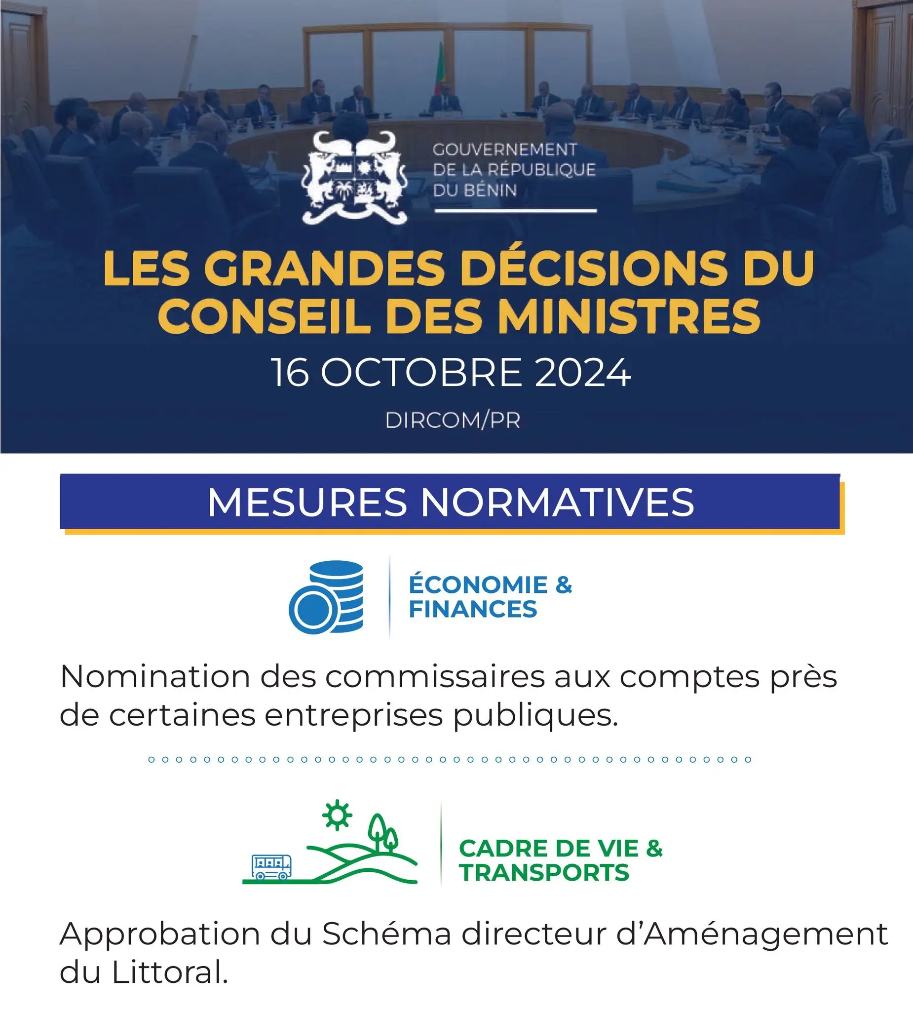 Le gouvernement béninois a une fois encore tenu son conseil des ministres ordinaires ce mercredi 16 octobre 2024. Durant cette réunion tenue sous la présidence du Président Patrice Talon, beaucoup de décisions ont été prises, dont en voici les grandes lignes.