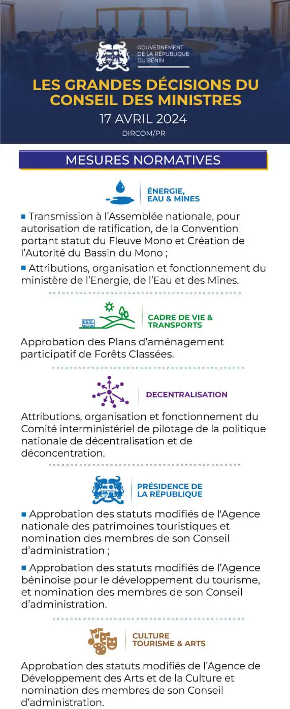Le Conseil des ministres s’est tenu ce mercredi 17 avril 2024 au Palais de la Marina sous la présidence du Chef de l’Etat, le président Patrice Talon. Les décisions ci après ont été prises: