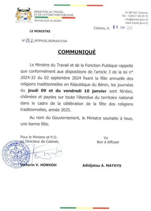 En raison de la célébration de la fête annuelle des religions traditionnelles au Bénin, les journées du jeudi 09 et vendredi 10 janvier 2025 sont déclarées fériées, chômées et payées sur toute l’étendue du territoire national. L’information a été rendue publique à travers un communiqué du Ministre du Travail et de la Fonction Publique. Retrouvez ci-joint le communiqué.