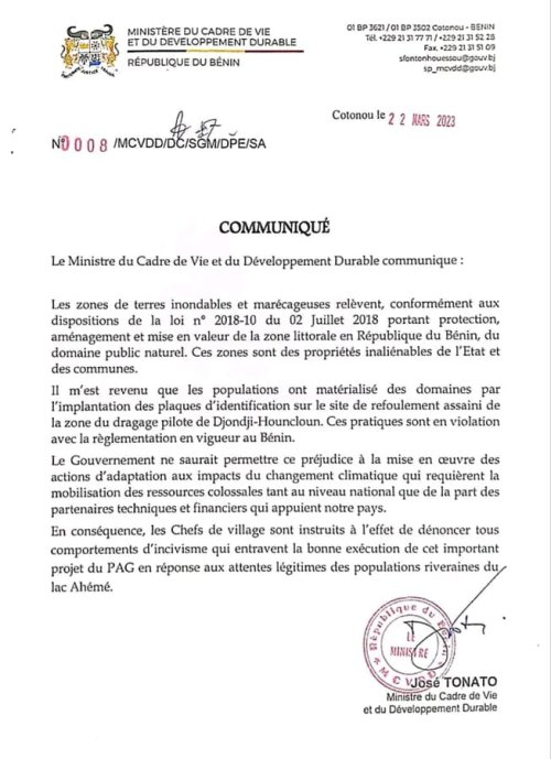 Dans ledit communiqué, le Ministre du Cadre de vie et du Développement durable José Tonato invite les populations qui matérialisent des domaines par l’implantation des plaques d’identification sur le site de refoulement assaini de la zone du dragage pilote de Djondji-Houncloun à cesser ces pratiques qui violent la règlementation en vigueur au Bénin.