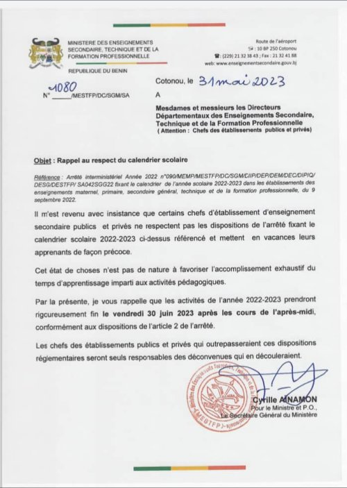 « …Par la présente, je vous rappelle que les activités de l’année 2022-2023 prendront rigoureusement fin le vendredi 30 Juin après les cours de l’après-midi conformément aux dispositions de l’article 2 de l’arrêté. Les chefs des établissements publics qui outrepasseront ces dispositions réglementaires seront seuls responsables des déconvenues qui en découleraient », a précisé le ministre dans sa correspondance.