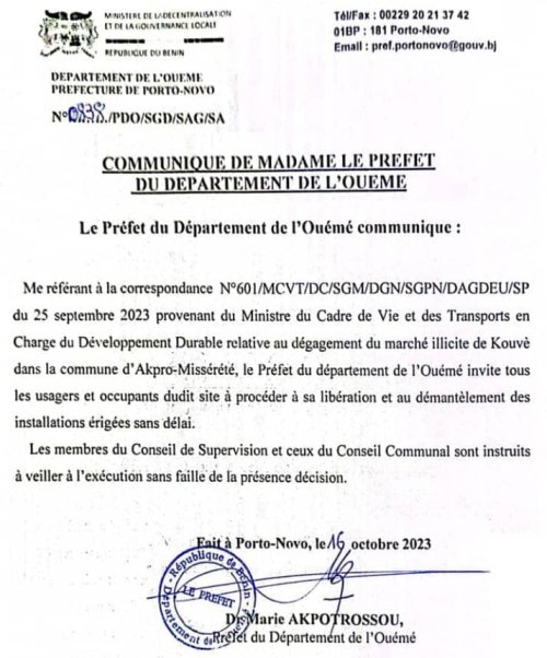 En effet, par correspondance N°601/MCVT/DC/SGMDGN/DAGDEU/UP du 25 septembre 2023, le ministère du Cadre de Vie, des Transports et du Développement Durable a instruit le préfet de faire libérer l’espace faisant office de marché « illicite » de Kouvè. Pourtant, selon les informations, ce marché aurait été attribué aux occupants par les élus communaux.