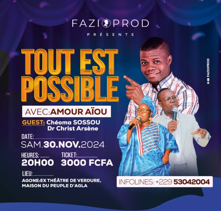 Les artistes invités, comme Chéoma Sossou et Dr Christ Arsène, viendront enrichir cette soirée d’exception, faisant de « Tout est possible » un moment inoubliable. Amour Aïou, lauréat du prix Jeune Talent aux trophées Agone, a su s’imposer sur de nombreuses scènes nationales et internationales.