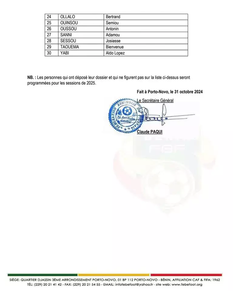 Bénin-Licence D CAF 2024: la liste des candidats retenus pour la session 05