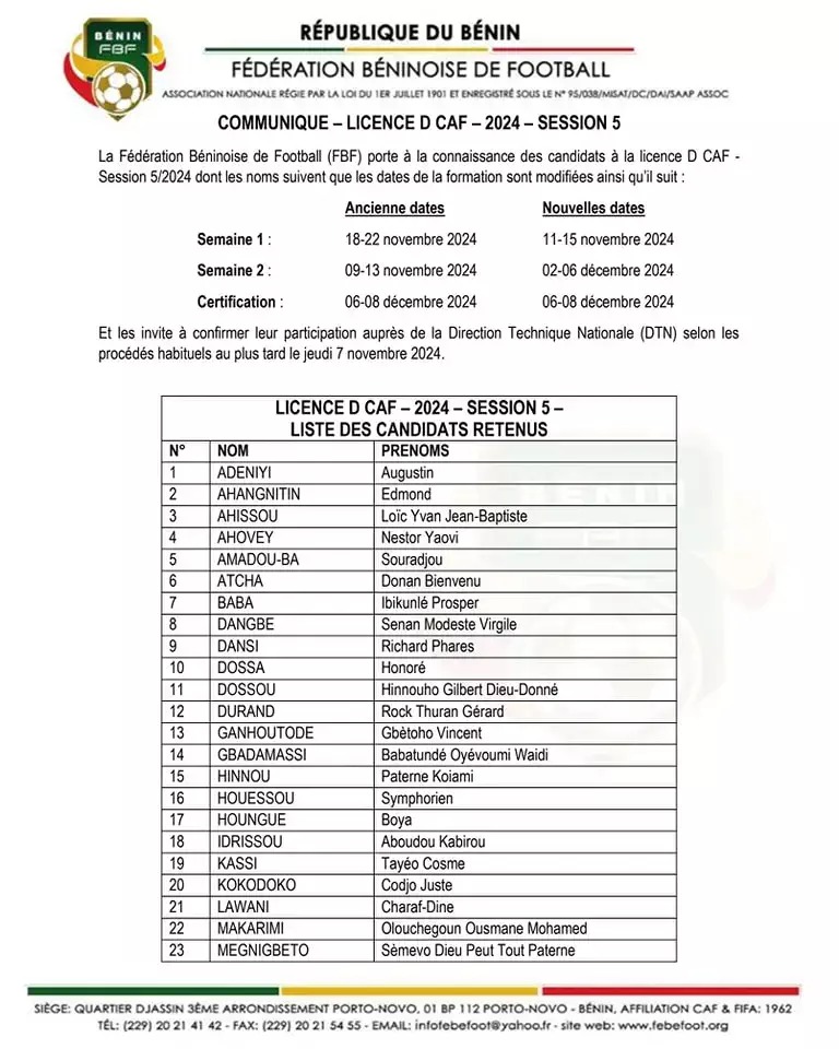 Dans un communiqué publié sur sa Page Facebook, le mardi 5 novembre 2024, la Fédération Béninoise de Football (FBF) a levé un coin de voile sur la liste des candidats sélectionnés pour la Licence D de la Confédération Africaine de Football, Session 5 de 2024.