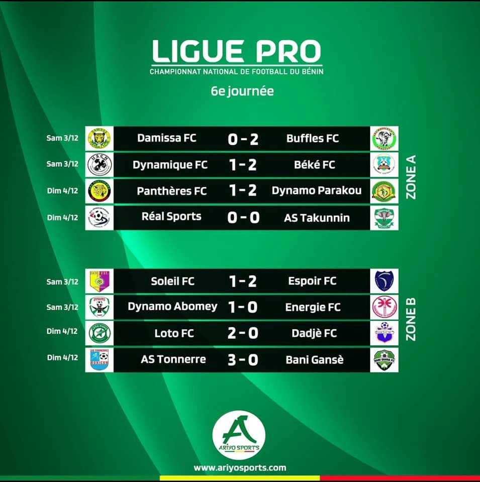 Découvrez les résultats des rencontres disputées ce weekend, comptant pour la sixième journée de la Ligue professionnelle de football du Bénin.