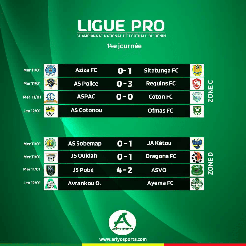 Découvrez les résultats des rencontres disputées mercredi, comptant pour la 14è journée de la saison 2022-2023 de Bénin Ligue Pro.