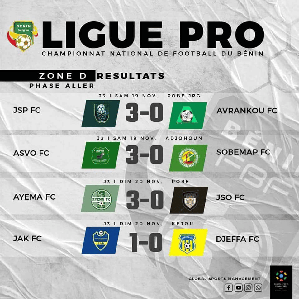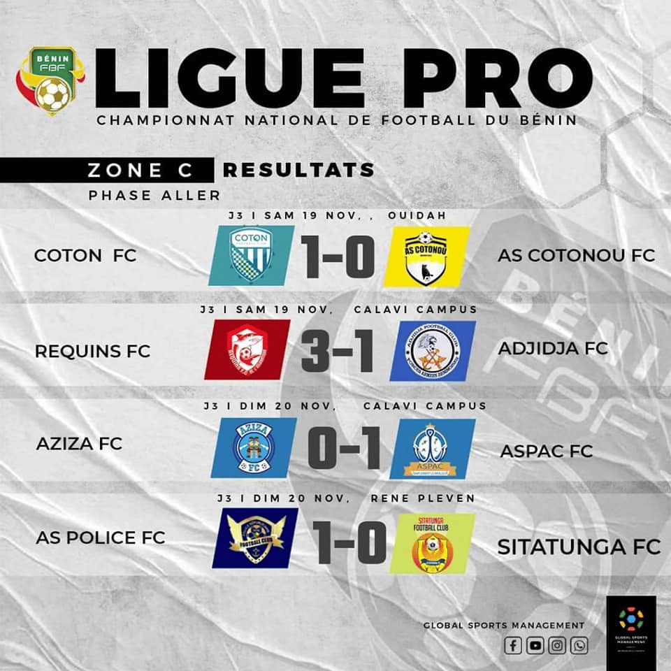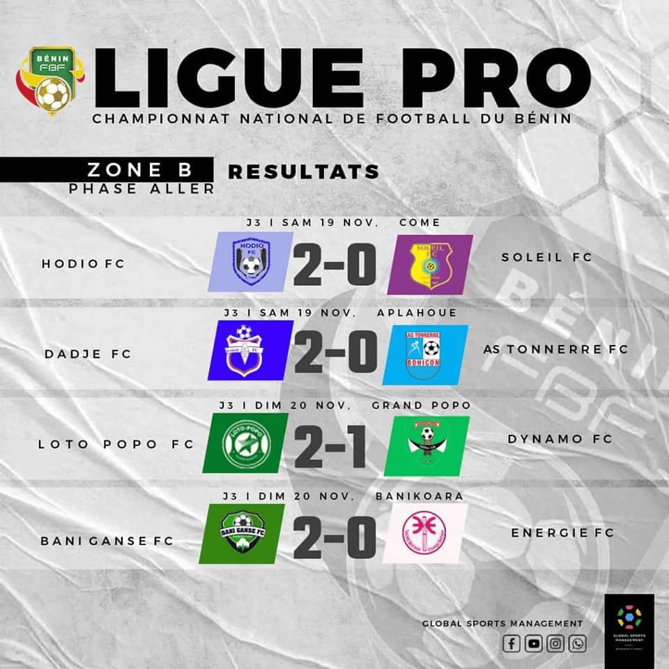 Découvrez les résultats des rencontres disputées ce weekend, comptant pour la troisième journée de la saison 2022-2023 de la Ligue professionnelle de football du Bénin.