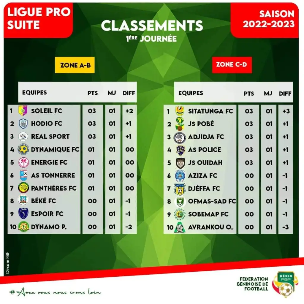 Alors que la Super Ligue Pro bat son plein sur les pelouses béninoises, la Ligue Pro Suite a démarré ce weekend avec les rencontres de la première journée. Découvrez les résultats des matchs disputés.