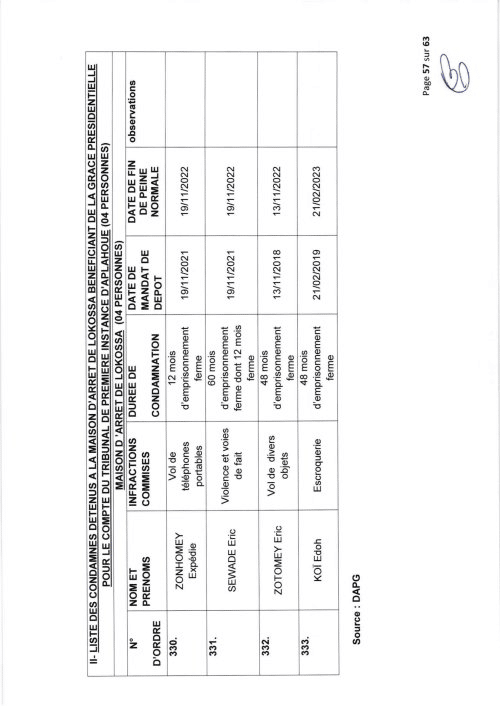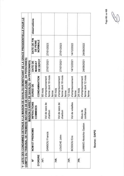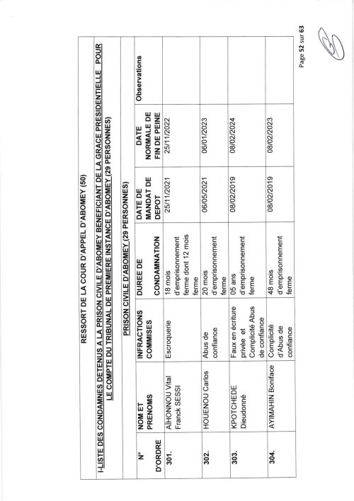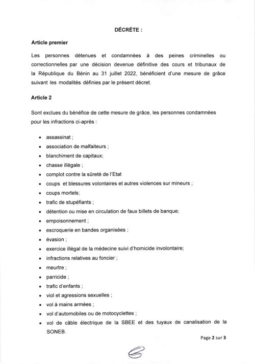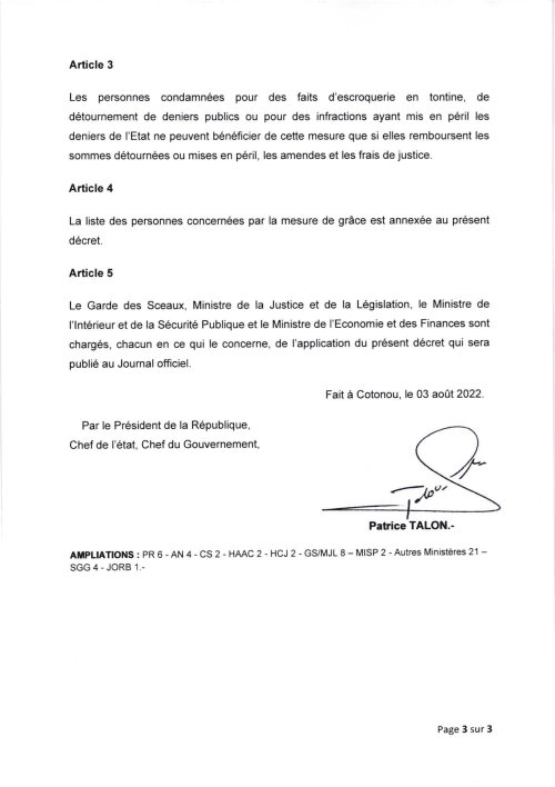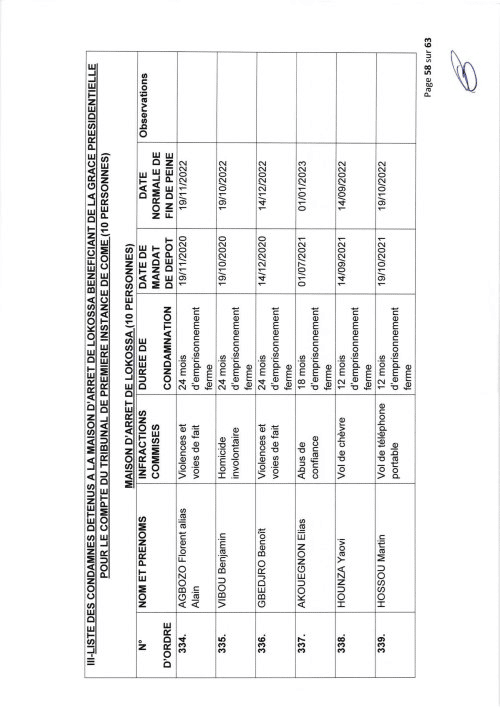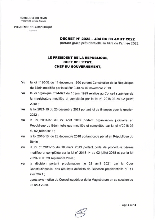 Dans le cadre de la célébration du 62e anniversaire d’indépendance du Bénin, le président Patrice Talon a gracié 350 détenus. La liste des bénéficiaires de la mesure de grâce présidentielle a été publié via le décret N°2022-494 du 03 août 2022.