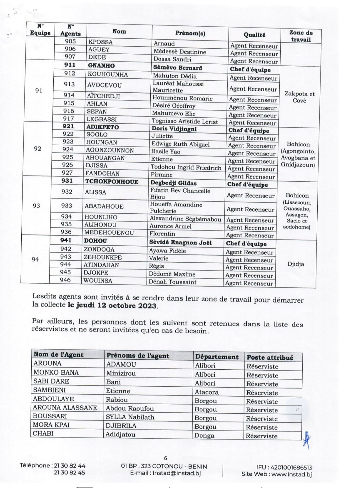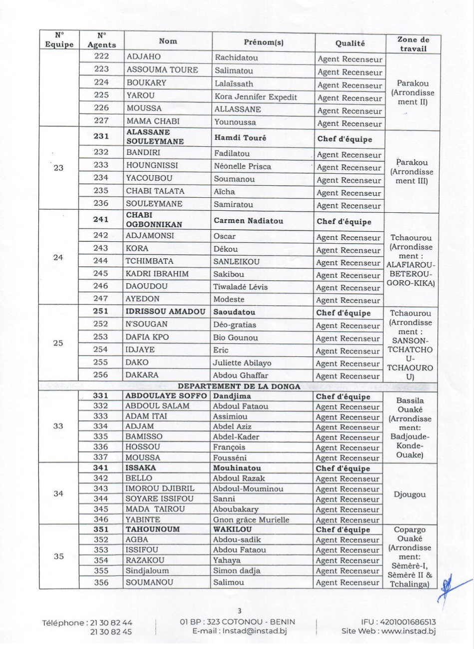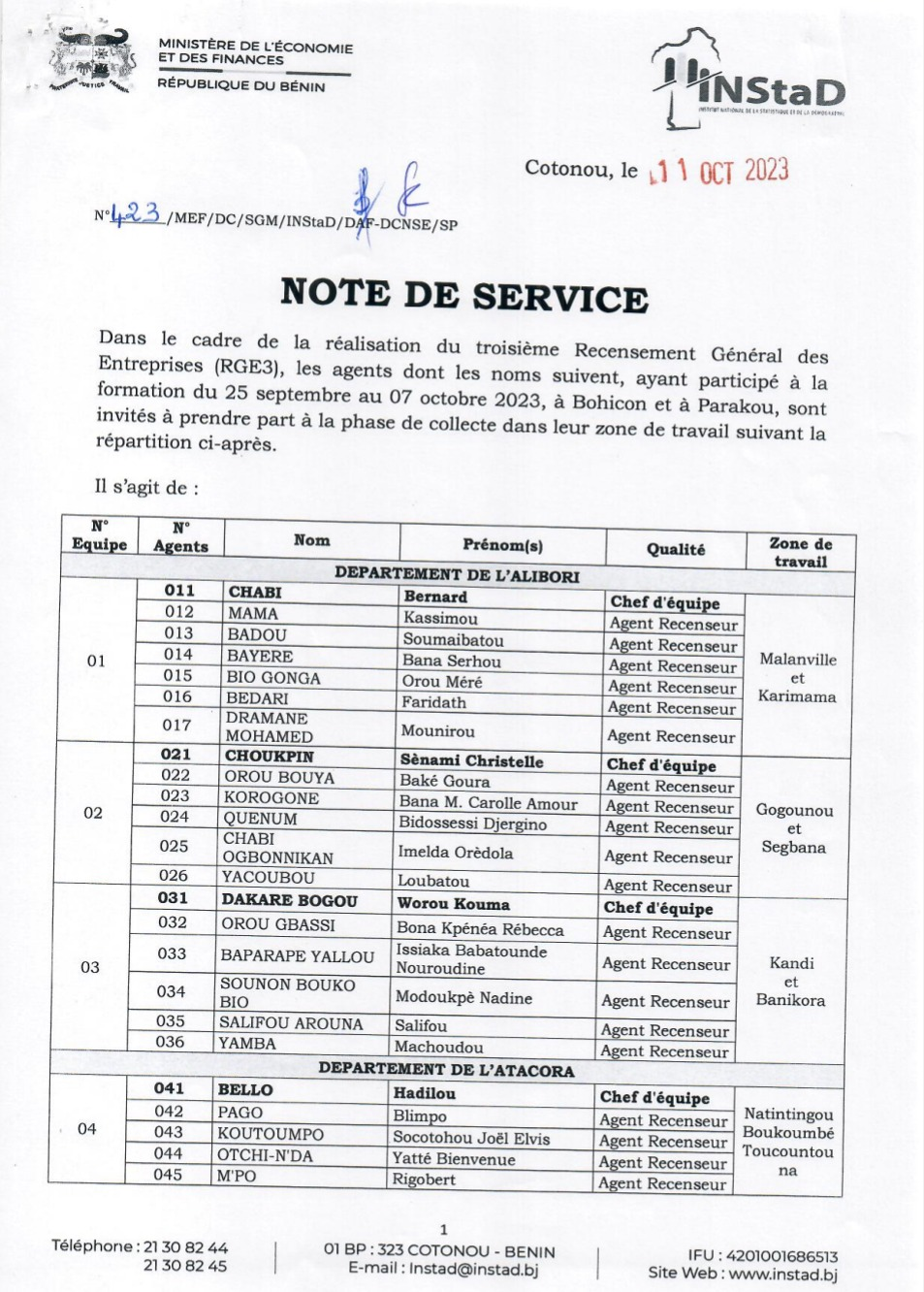 Les agents dont les noms suivent, ayant participé à la formation du 25 septembre au 07 octobre 2023 à Bohicon et à Parakou, sont retenus pour prendre part à la collecte de données dans le cadre de la réalisation du troisième Recensement Général des Entreprises (RGE3).