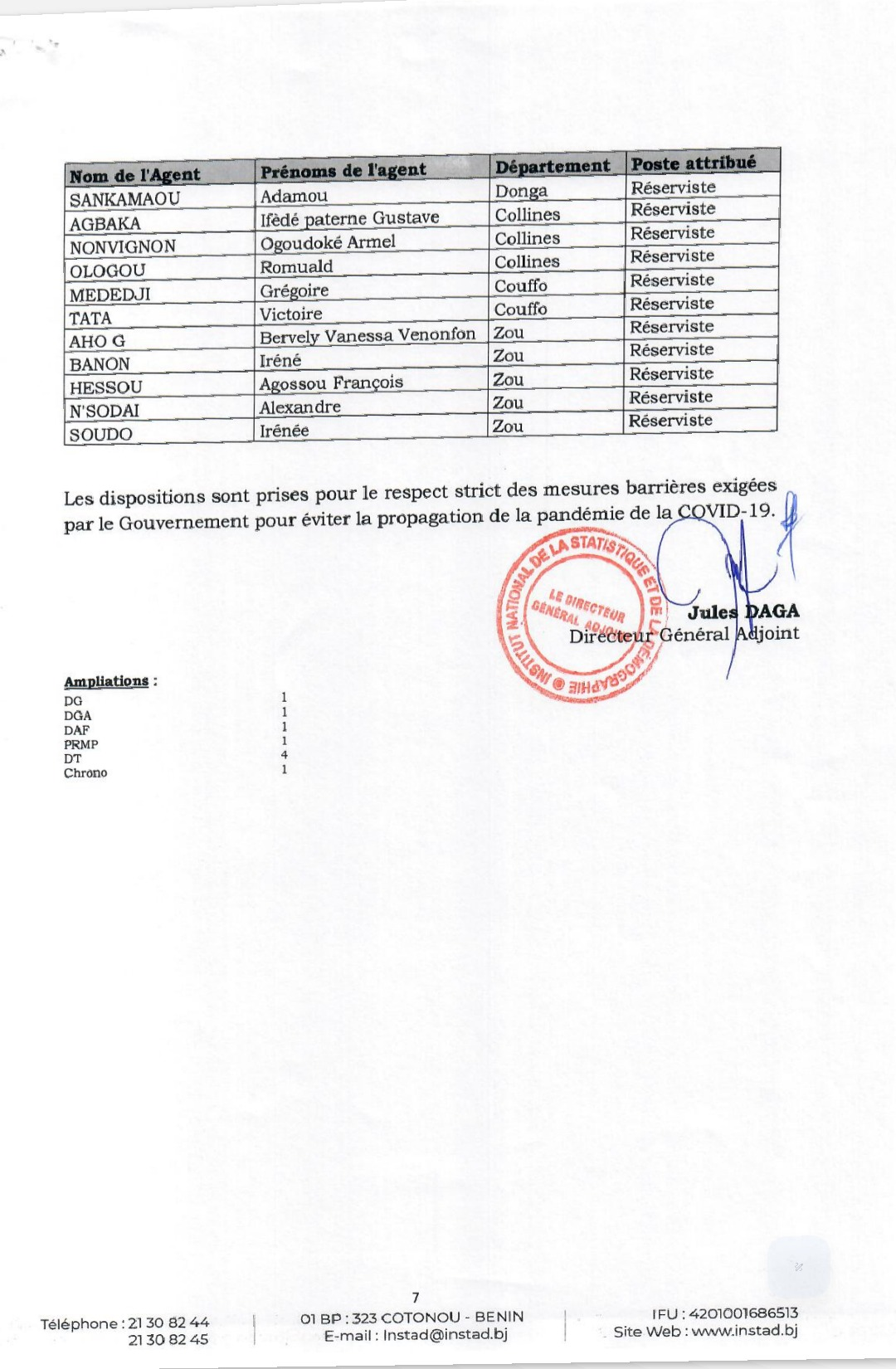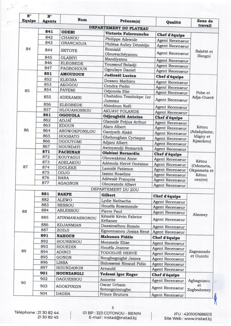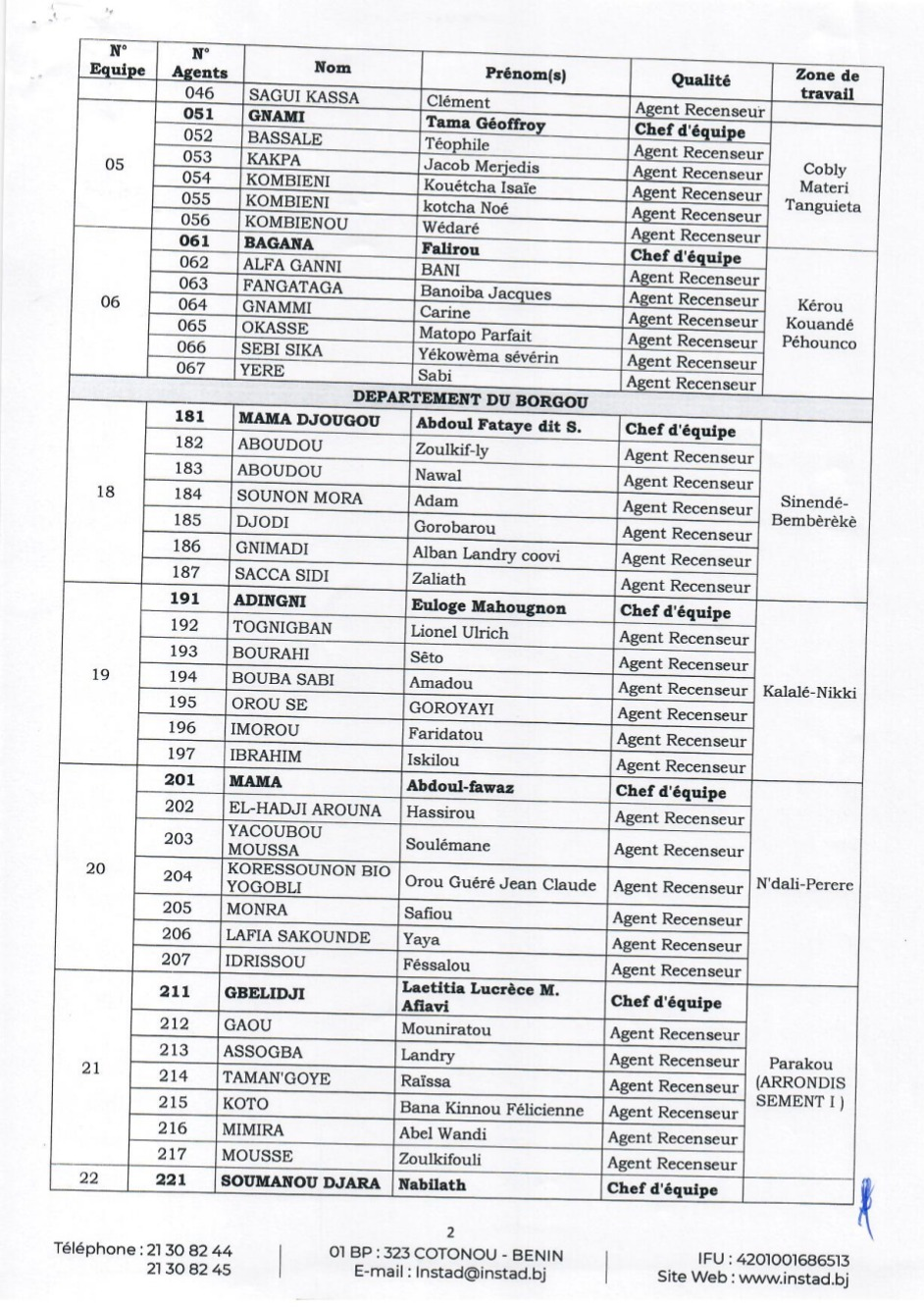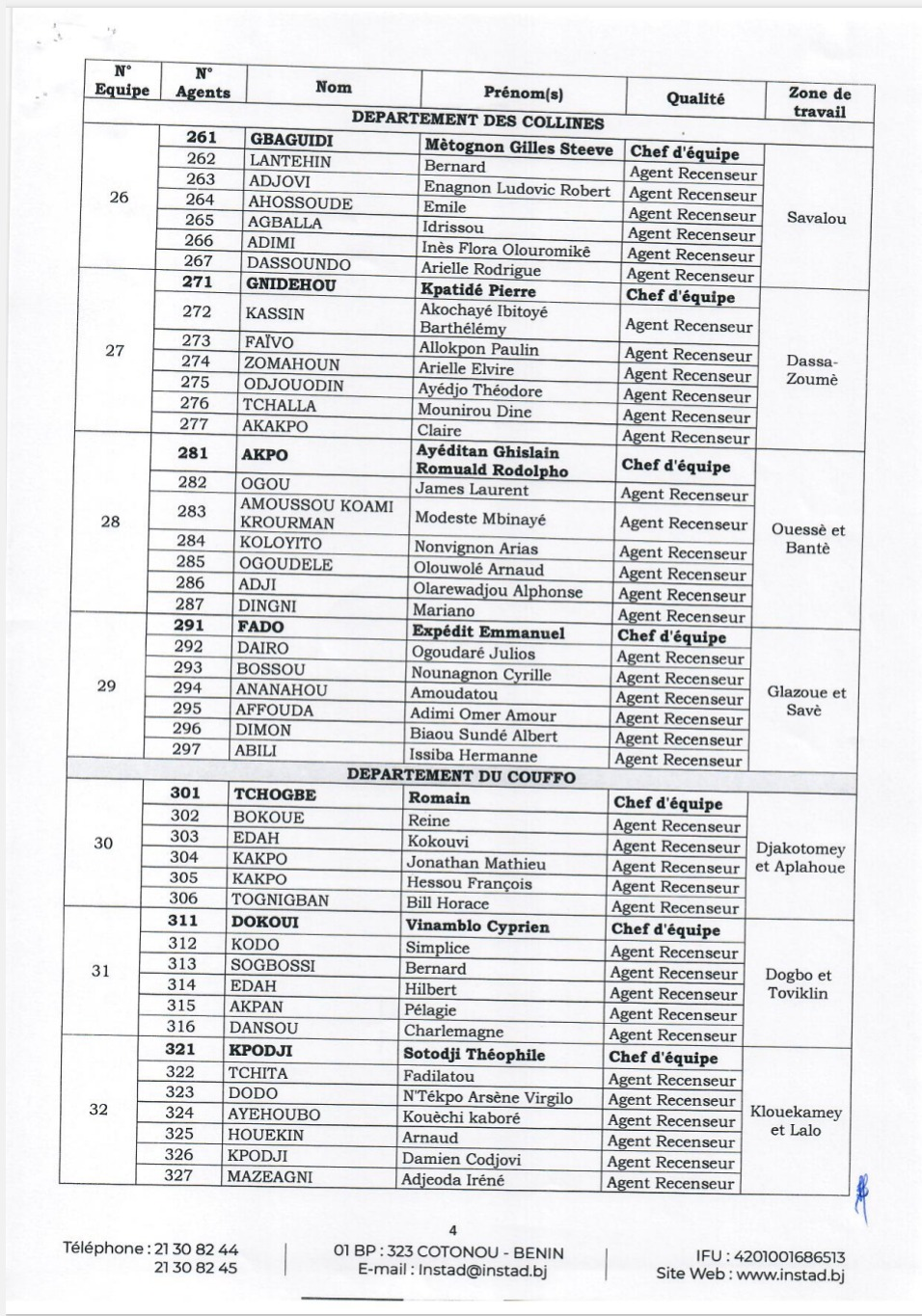 Les agents dont les noms suivent, ayant participé à la formation du 25 septembre au 07 octobre 2023 à Bohicon et à Parakou, sont retenus pour prendre part à la collecte de données dans le cadre de la réalisation du troisième Recensement Général des Entreprises (RGE3).