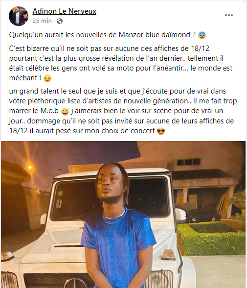 « Quelqu’un aurait les nouvelles de Manzor blue daïmond ? », a-t-il demandé. Pour Adinon, c’est bizarre que Manzor ne soit pas sur aucune des affiches de 18/12. Pourtant dit-il, « c’est la plus grosse révélation de l’an dernier, tellement il était célèbre les gens ont volé sa moto pour l’anéantir ».