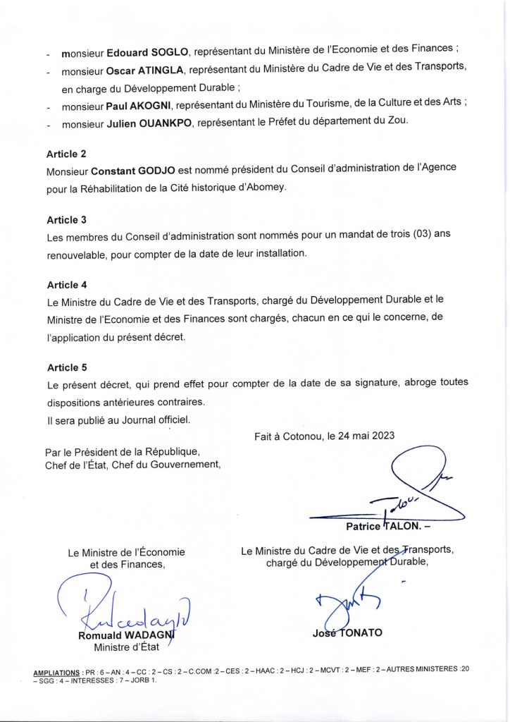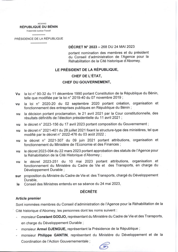 Le gouvernement a procédé à la nomination des membres du Conseil d’Administration de l’Agence pour la Réhabilitation de la Cité historique d’Abomey (ARCHA), par un décret pris en date du 24 mai 2023.