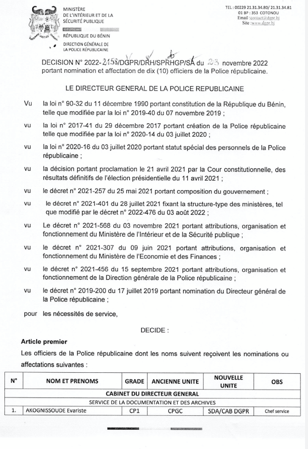 Le Directeur Général de la Police Républicaine (DGPR) a procédé à la nomination de 10 officiers, par une décision en date du 23 novembre 2022. Ils ont été automatiquement affectés dans de nouvelles unités.