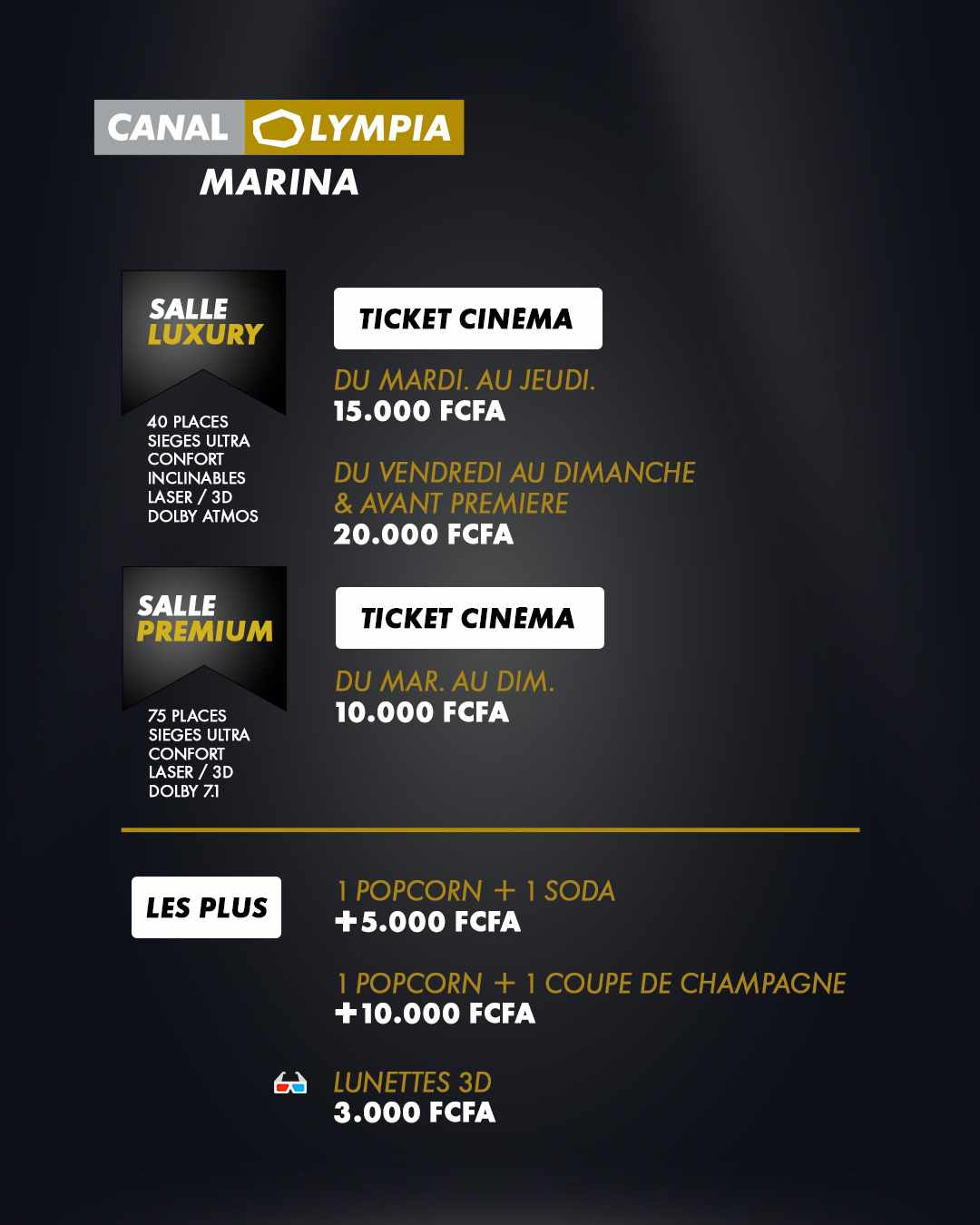 Selon la description faite par Floriane Déguénon, responsable de Canal Olympia Sofitel Cotonou Marina Hotel, le cinéma se compose de deux salles : « Luxury » et « Premium ».