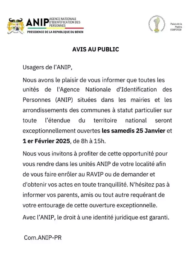 L’Agence Nationale d’Identification des Personnes (ANIP) annonce l’ouverture exceptionnelle de ses unités les samedis 25 janvier et 1er février 2025, de 8h à 15h, afin de faciliter les opérations d’enrôlement au RAVIP et les demandes d’actes d’état civil.