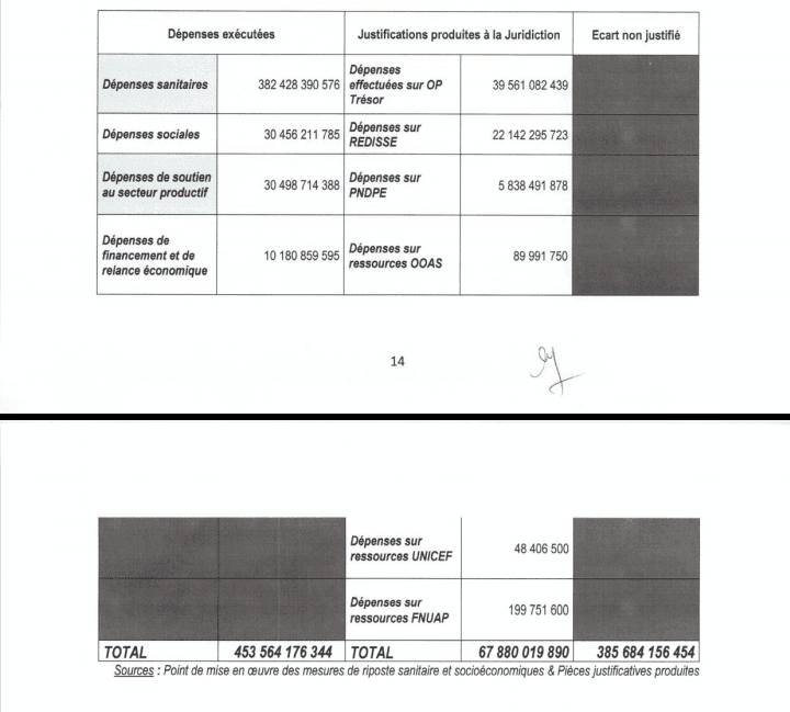 En effet, les informations issues du « point de mise en oeuvre des mesures de riposte sanitaire et socioéconomiques », de la situation sur chiffre des Ordre de Paiement (OP Trésor) payés par la Direction Générale du Trésor et de la Comptabilité Publique (DGTCP) et des pièces justificatives produites à la Cour des comptes, révèlent un montant total de trois cent quatre-vingt-cinq milliards six cent quatre-vingt-quatre millions cent cinquante-six mille quatre cent cinquante-quatre (385 684 156 454) francs CFA de dépenses non justifiées à la Cour. Le rapprochement entre dépenses exécutées et justificatifs produits se présente comme suit :