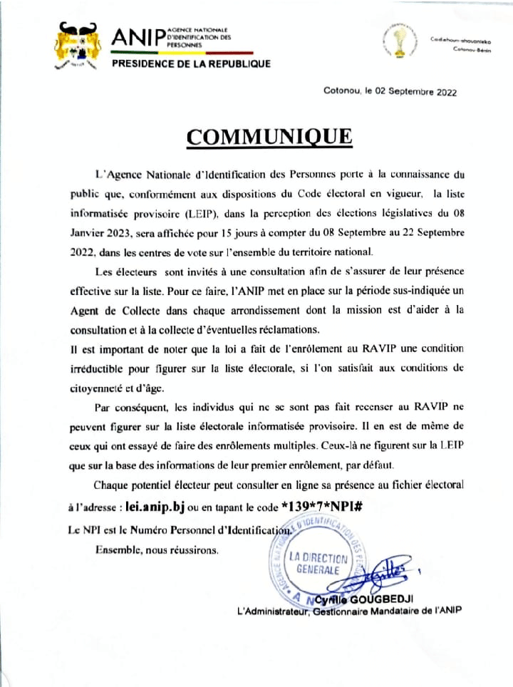 Dans la perspective de la tenue des élections législatives du 08 janvier 2022 au Bénin, l’agence nationale d’identification des personnes (ANIP), l’organe chargé de la confection de la liste électorale informatisée (LEI), va procéder les jours à venir à l’affichage de la liste électorale.