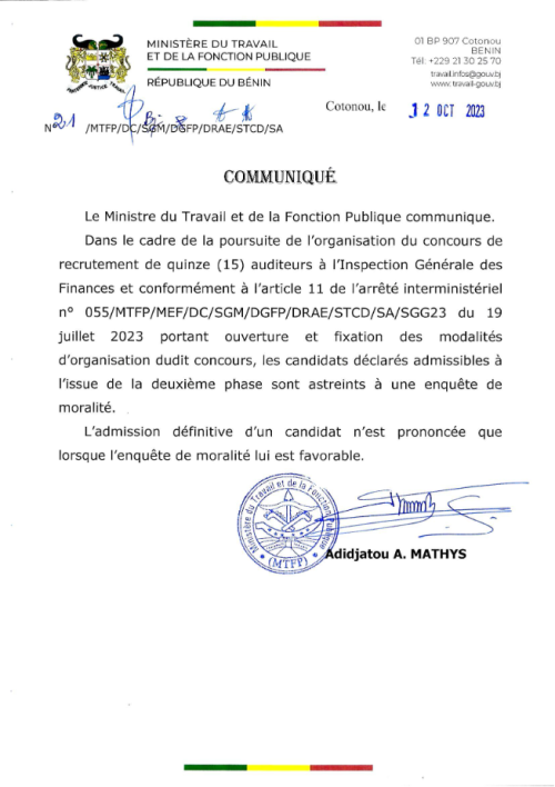 Selon le communiqué de Mathys Adidjatou, les candidats déclarés admissibles à l’issue de la deuxième phase seront astreints à une enquête de moralité.
