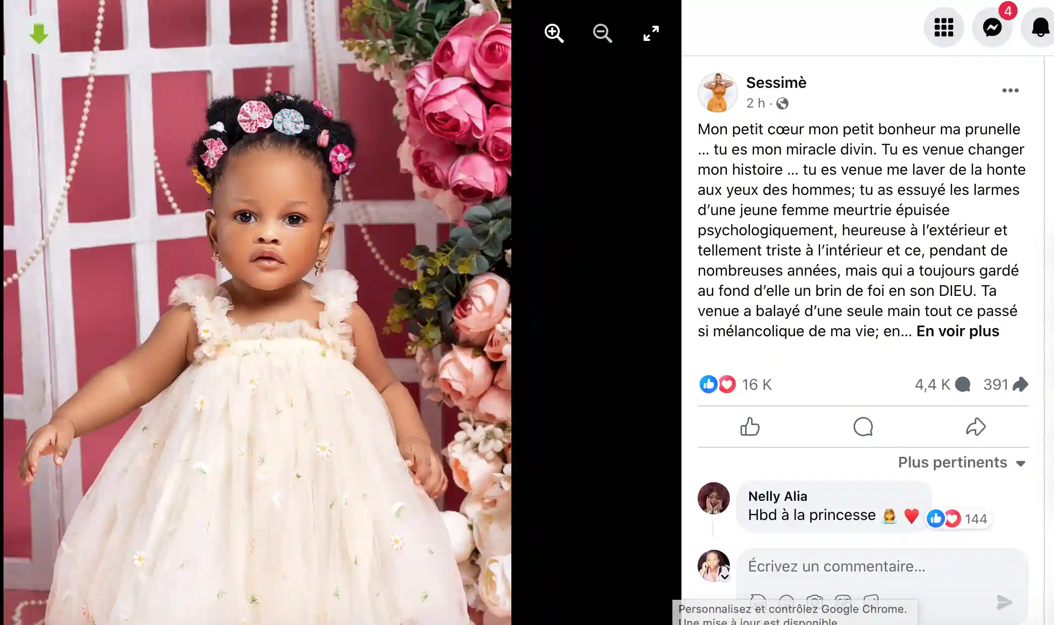 « Mon petit cœur mon petit bonheur ma prunelle … tu es mon miracle divin. Tu es venue changer mon histoire … tu es venue me laver de la honte aux yeux des hommes; tu as essuyé les larmes d’une jeune femme meurtrie épuisée psychologiquement, heureuse à l’extérieur et tellement triste à l’intérieur et ce, pendant de nombreuses années, mais qui a toujours gardé au fond d’elle un brin de foi en son Dieu », a écris Sessimè.