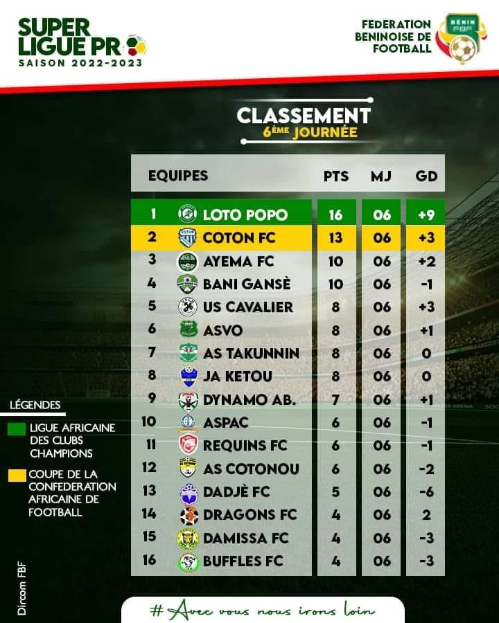 La phase aller de la Super Ligue Pro se poursuivait mercredi avec les rencontres de la sixième journée. Pas moins de huit matchs ont été disputés à travers les pelouses béninoises. Tenu en échec par ASVO (2-2) le weekend dernier, Loto-Popo a retrouvé le chemin de la victoire.