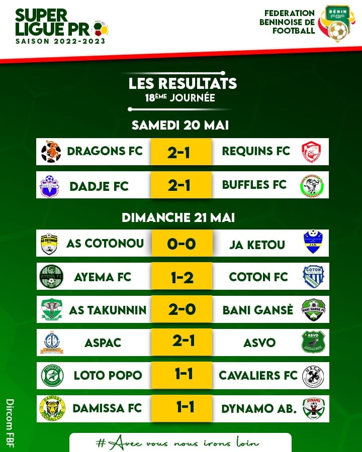 Seul en tête, Coton FC a fait un pas de plus vers le titre après sa victoire face à Ayéma (2-1) ce weekend. Neutralisé par Cavaliers (1-1), Loto-Popo perd des points dans le classement. Voici le point complet de la 18è journée de la Super Ligue Pro.