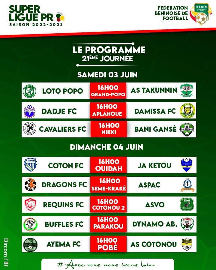C’est également la mission de Loto-Popo qui reçoit Takunnin dans son antre à Grand-Popo. Tombeurs d’ASVO (1-0) en milieu de semaine, les Loto Boys visent une nouvelle victoire pour ne pas trop se distancer de Coton FC dans la course au titre. Dans les autres rencontres, Cavaliers et Bani Gansè se retrouveront dans le nord du Bénin pour un duel décisif. Battu par Ayéma (1-2) lors de la précédente journée, Dynamo d’Abomey se déplacera de son côté sur la pelouse de Buffles.