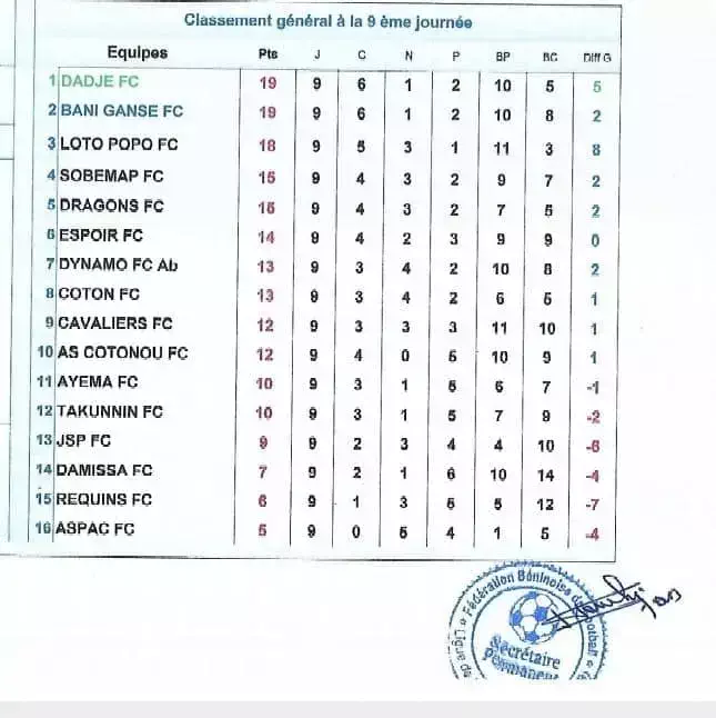 Bénin-Super Ligue Pro: Dadjè FC nouveau leader, le point de la 9è journée