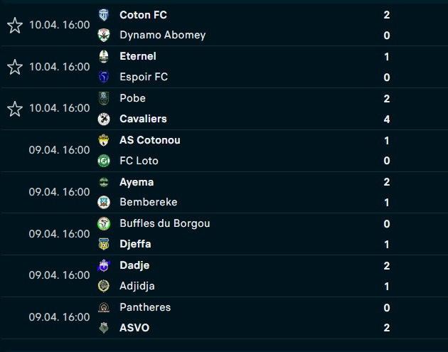 Dans les autres rencontres, les Panthères ont été défaits à domicile par l’ASVO. Un résultat qui permet au vainqueur de remonter à la 8è place du classement avec 11 points. À noter la défaite des Buffles du Borgou sur leur pelouse contre Djeffa sur le score de 0-1. Une victoire qui permet au club de la capitale économique du Bénin de revenir à seulement un point du leader du championnat. Installé a la dernière place du classement, Adidja a été battu par Dadje (2-1). Le carton de cette 9è journée a été l’œuvre des Cavaliers qui ont explosé Pobè sur le score de 4-2.