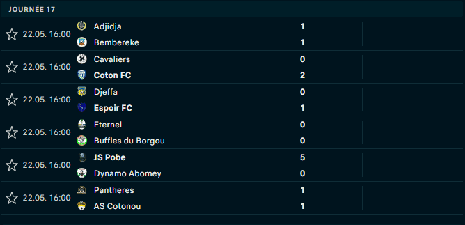 Bénin Super Ligue Pro: tous les résultats de la 17è journée