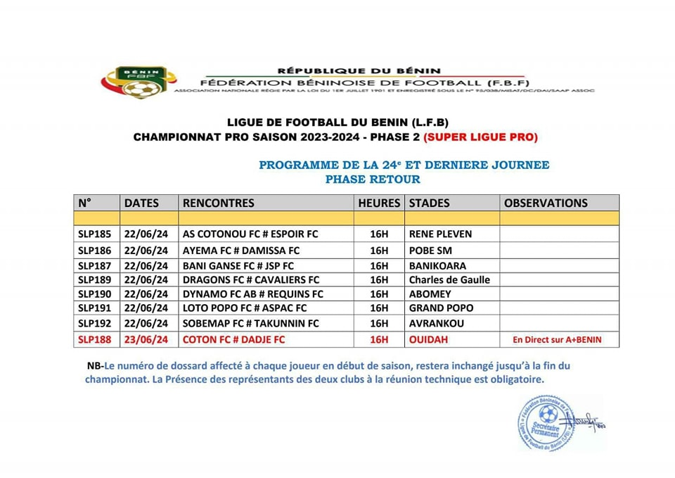 Bénin-Super Ligue Pro: un choc Coton-Dadjè, le programme de la 24è journée