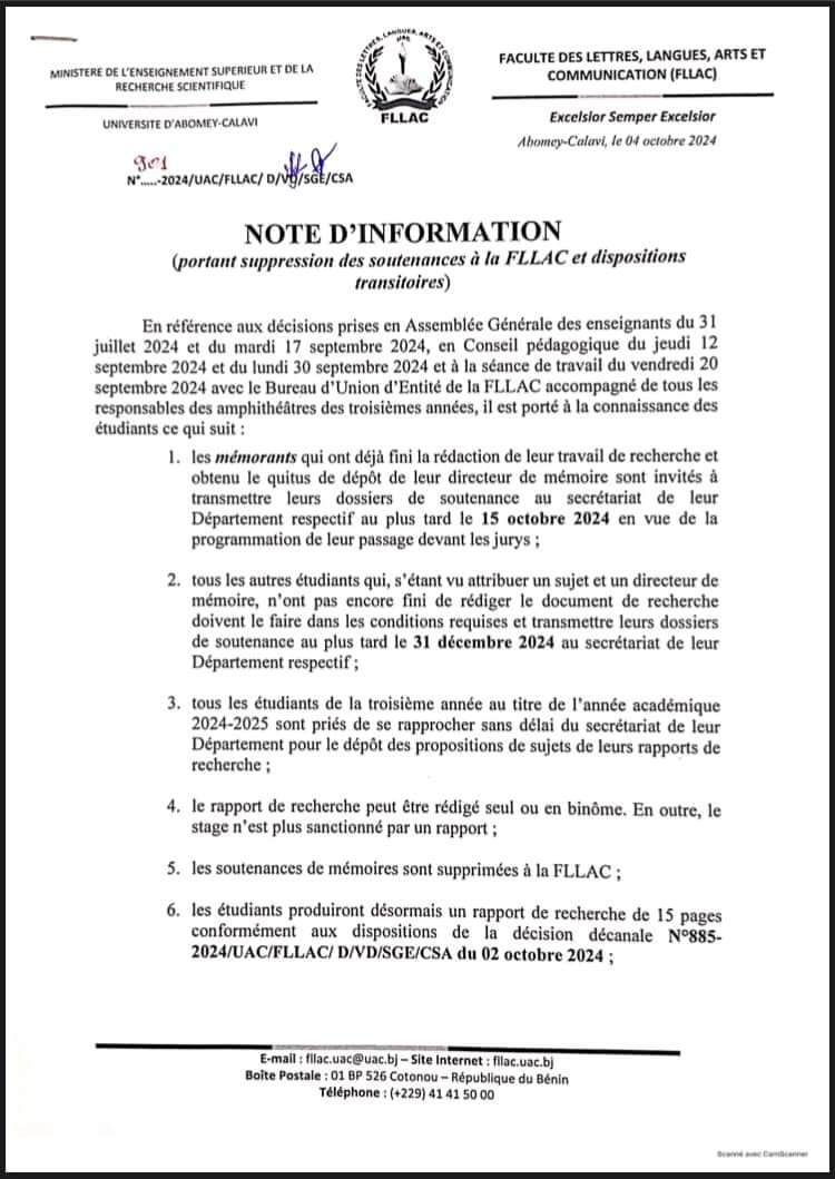 Dans un communiqué officiel diffusé le vendredi 4 octobre 2024, le doyen de la Faculté des Lettres, Langues, Art et Communication (FLLAC) a annoncé une réforme majeure concernant le processus de soutenance des étudiants.