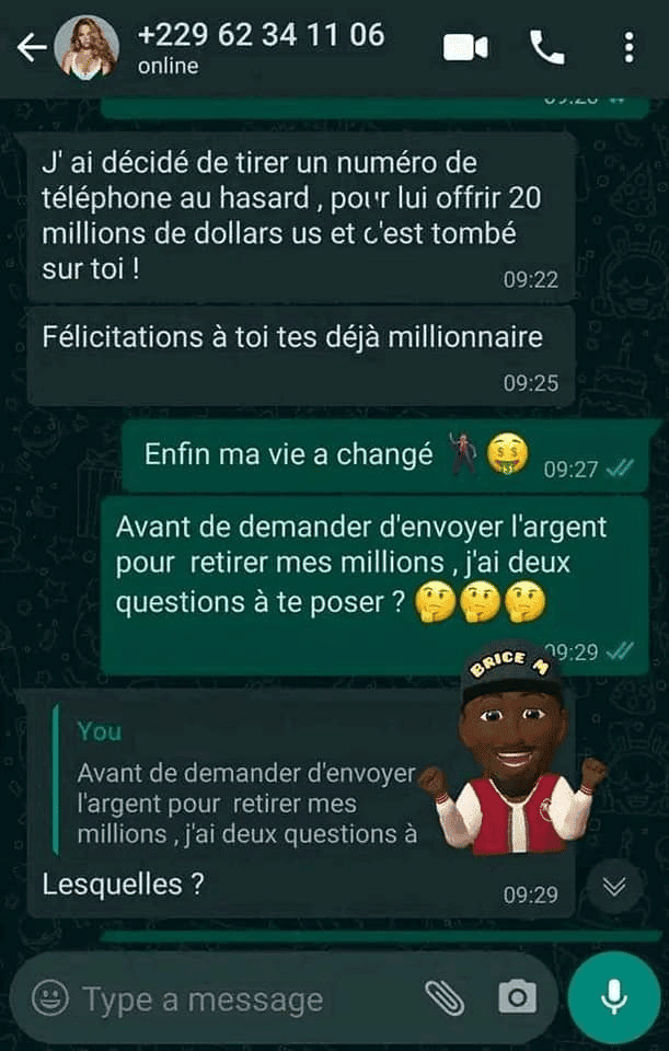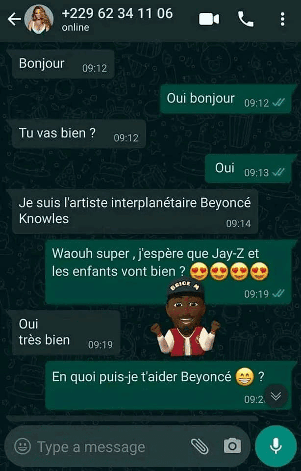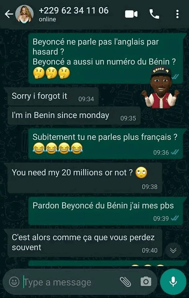 « Je suis l’artiste interplanétaire Beyonce Knowles (.. ) J’ai décidé de tirer un numéro au Hazard pour lui offrir 20 millions de dollars US et c’est tombé sur toi« , a écrit la présumée Beyoncé via le réseau social WhatsApp avec un numéro du Bénin. Bien que rien ne prouve qu’il s’agisse réellement d’un des leurs, les béninois se sont dépêchés de commenter la publication pour donner leur avis et rappeler à Mani Bella de quoi sont capables les béninois en manière de sorcellerie et ou du vodoun.