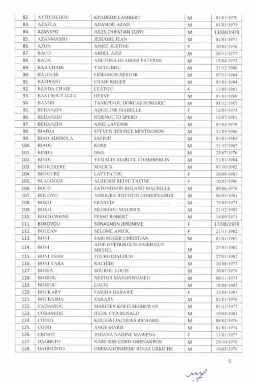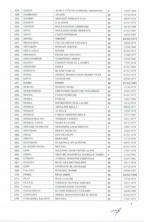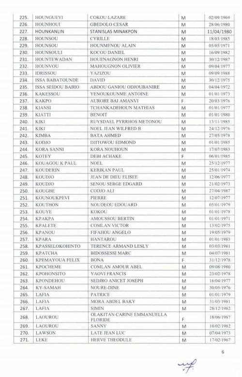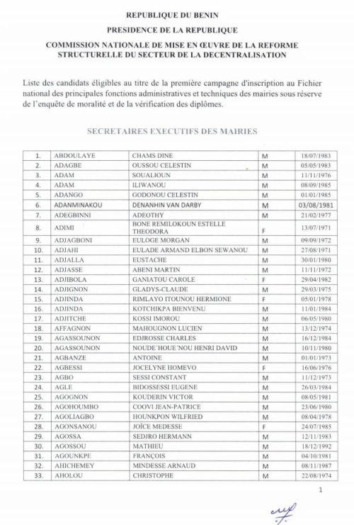 Le secrétaire exécutif doit, en outre, justifier d’une bonne connaissance de la mise en œuvre du processus de la décentralisation et de la déconcentration. Il est nommé parmi les cadres sélectionnés et inscrits au Fichier national des principales fonctions administratives des mairies. Toute personne tirée au sort du Fichier national des principales fonctions administratives des mairies pour être nommée dans la fonction de secrétaire exécutif peut décliner la proposition. Ainsi, à l’issue du processus de sélection, les personnes ci-après sont retenues comme éligibles au poste de secrétaire exécutif des mairies.