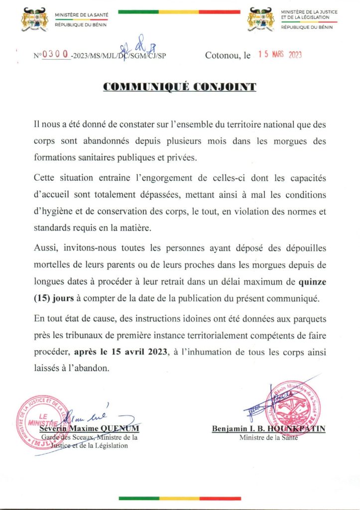 Dans un communiqué conjoint, le Ministre de la Santé et son collègue de la Justice ont invité les familles des défunts dont les corps sont laissés à la morgue (publique et privée) depuis longtemps, à faire diligence pour les retirer.