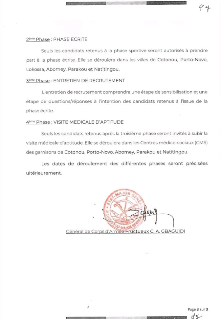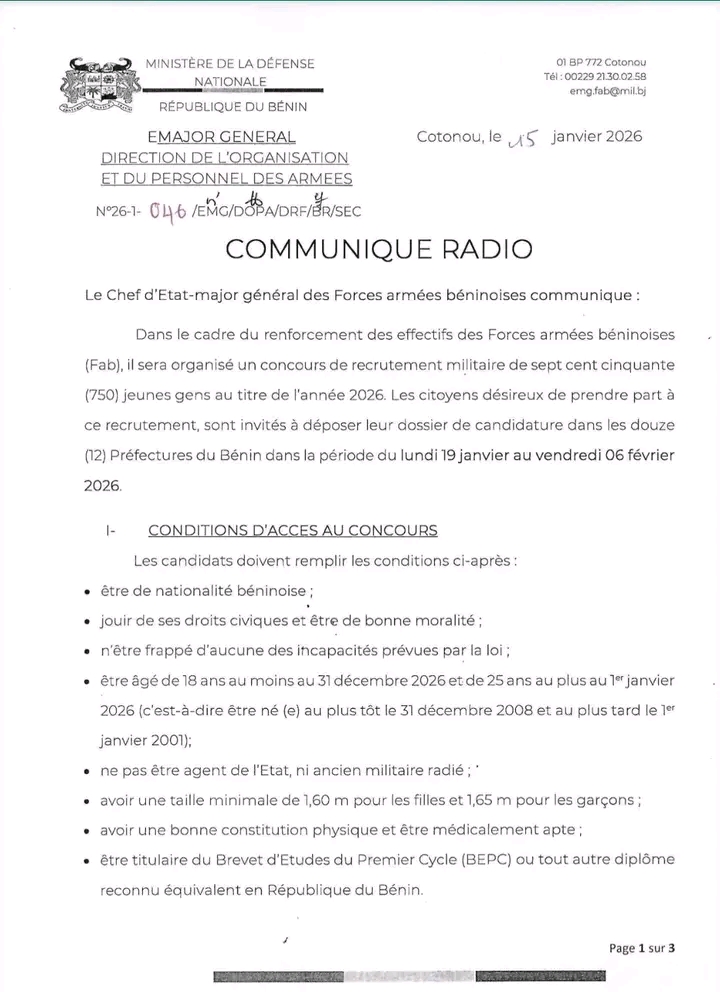 Ce recrutement vise à renforcer les effectifs des Forces armées béninoises, dans un contexte où la sécurité nationale reste une priorité.