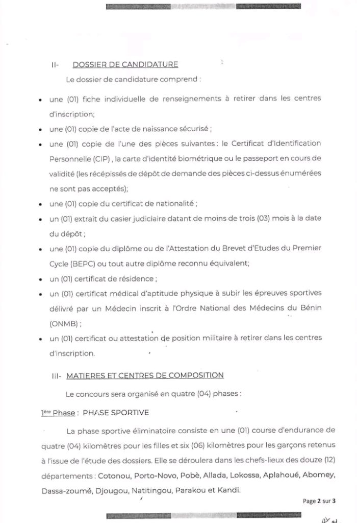 Les candidats intéressés sont invités à déposer leur dossier de candidature dans l’une des douze préfectures du Bénin, du lundi 19 janvier au vendredi 06 février 2026.