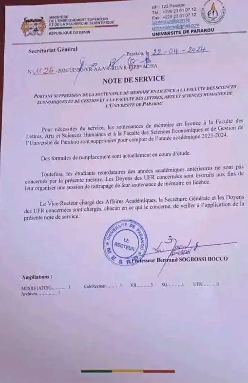 Les soutenances de mémoires de licence ont été supprimées à la FLASH et à la FASEG à l’Université de Parakou, par le recteur. Il l’a fait savoir à travers une note de service.