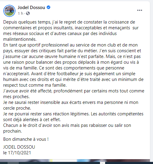 Pour Jodel Dossou, avant d’être footballeur, il est également un simple humain avec des droits et qui mérite d’être traité avec un minimum de respect tout comme ma famille. « J’avoue avoir été affecté, profondément par certains mots tout comme mes proches. Je ne saurai rester insensible aux écarts envers ma personne ni mon cercle proche. Je ne pourrai rester sans réaction légitimes. Les autorités compétentes sont déjà alertées à cet effet. Chacun a le droit d’avoir son avis mais pas rabaisser ou salir son prochain »,a-t-il mis en garde.