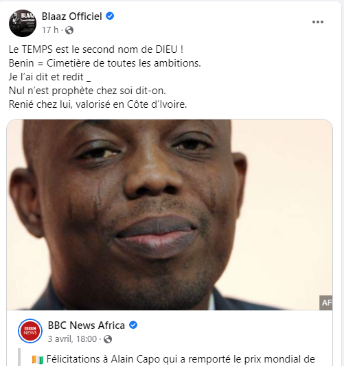 En réponse, Blaaz n’a pas fait dans la dentelle pour crier son ras-le-bol. « Le Temps est le second nom de Dieu ! Bénin = Cimetière de toutes les ambitions. Je l’ai dit et redit. Nul n’est prophète chez soi dit-on. Renié chez lui, valorisé en Côte d’Ivoire », a commenté le promoteur du Groupe Allure.
