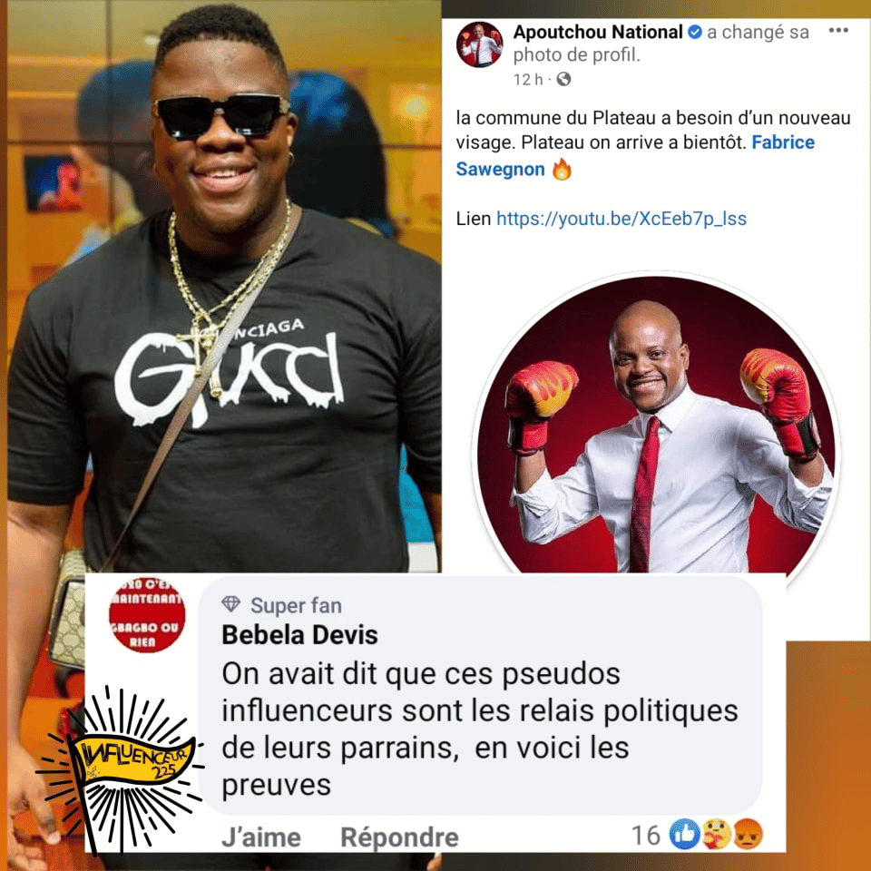 Des réactions négatives ont été observées chez certains abonnés de la page Facebook d’Apoutchou National, un blogueur ivoirien connu pour ses vidéos à succès sur les réseaux sociaux. En effet, une de ses publications en faveur du candidat du RHDP, Fabrice Sawegnon, aux municipales dans la commune de Plateau a suscité l’indignation de certains de ses abonnés.