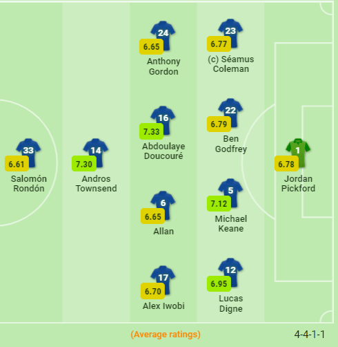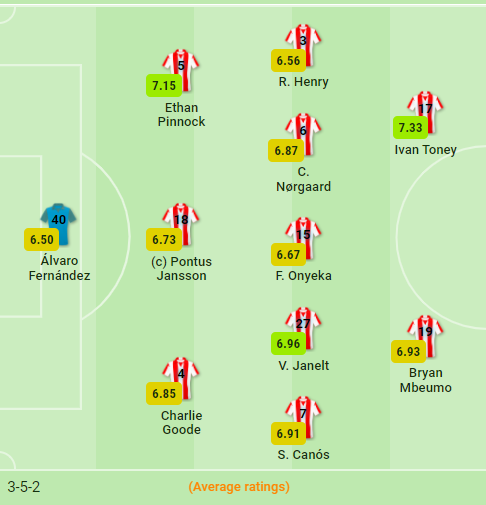 Pour cette rencontre, l’entraîneur de Brentford a opté pour 3-5-2, avec Alvaro Fernandez dans les buts. La défense à trois est composée par Pinnock, Jansson et Goode. En attaque, Toney accompagne Bryan Mbeumo. De son côté, Rafael Benitez a aligné Everton en 4-4-1-1. Salomon Random occupe seul la pointe de l’attaque. L’ailier nigérian Alex Iwobi est titulaire.