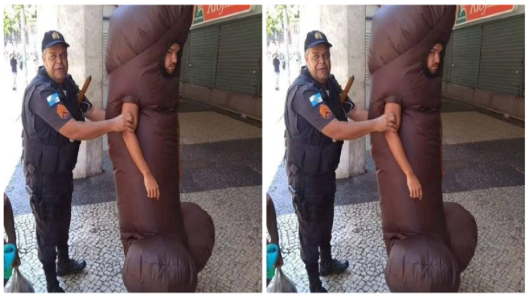 La police militaire de Rio de Janeiro, au Brésil, a arrêté dimanche un homme déguisé en phallus géant dans le centre-ville pour « avoir agi de manière suspecte ». Une photo de l’arrestation montre l’homme portant un costume de virilité gonflable alors qu’il était paisiblement emmené par un officier.