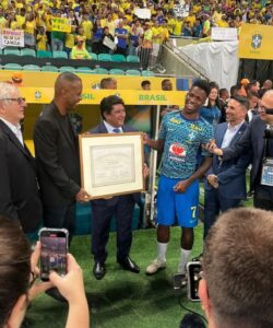 À travers un test ADN réalisé sous l’égide de la Fédération brésilienne de football, il a été révélé que les ancêtres de l’attaquant auriverde sont originaires du Cameroun. Cette découverte a été officialisée par la remise d’un certificat à Vinicius Jr avant le match crucial face à l’Uruguay, dans le cadre des éliminatoires de la Coupe du monde 2026.