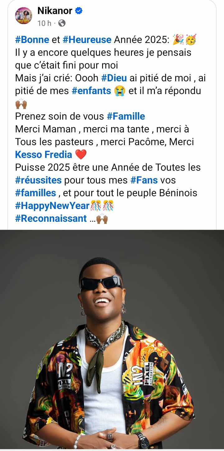 Dans son message, Nikanor adressait des remerciements spécifiques à plusieurs personnes dont sa femme Fredia Kesso, sans mentionner Sessimè, elle aussi sa compagne. Une omission qui a suscité une réaction vive de la chanteuse sur ses réseaux sociaux.