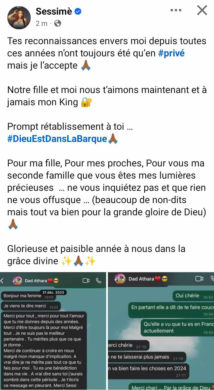 Dans un post publié peu après les vœux de Nikanor, Sessimè a exprimé son mécontentement en évoquant un manque de reconnaissance public. Elle a écrit : « Tes reconnaissances envers moi depuis toutes ces années n’ont toujours été qu’en #privé mais je l’accepte. » Un message assorti d’un clin d’œil à leur relation et de souhaits de prompt rétablissement à l’artiste, tout en soulignant l’importance de leurs proches et de leur fille.
