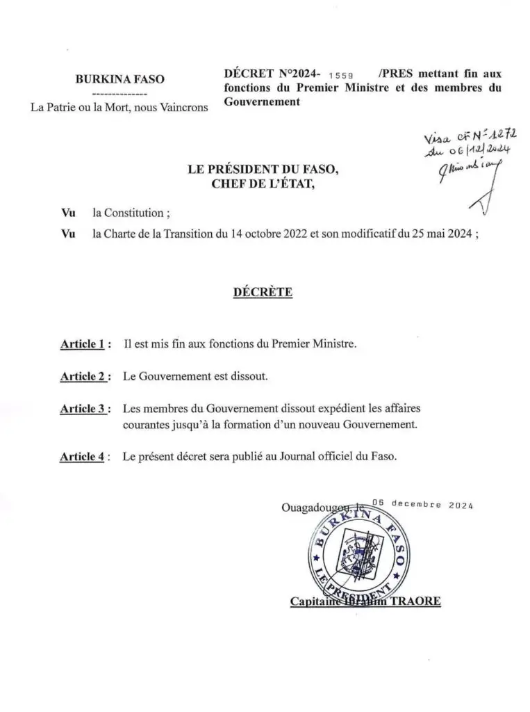 Par un décret signé ce vendredi 6 décembre, et lu au JT de 20h de la Télévision publique (RTB), le capitaine Ibrahim Traoré, président de la Transition au Burkina Faso, a annoncé la fin des fonctions du Premier ministre et la dissolution du gouvernement.